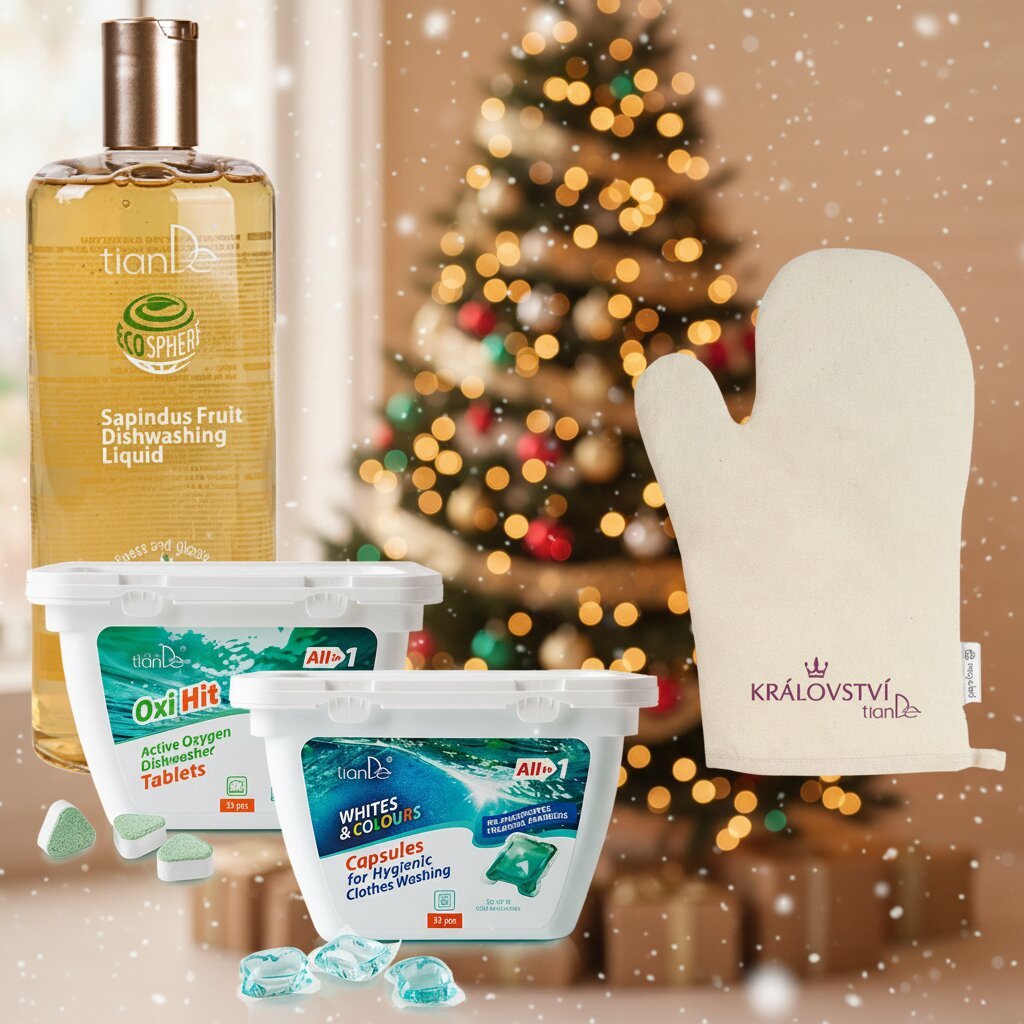 Kompletná sada prírodných čistiacich prostriedkov pre dokonalú čistotu vášho domova. Účinná kombinácia kapsúl na pranie, tabliet do umývačky riadu a prostriedku na umývanie riadu z plodov mydlice lekárskej zaručuje žiarivo čisté oblečenie, riad a kuchyňu. Ako darček dostanete praktickú kuchynskú chňapku na ochranu rúk pri manipulácii s horúcim riadom.