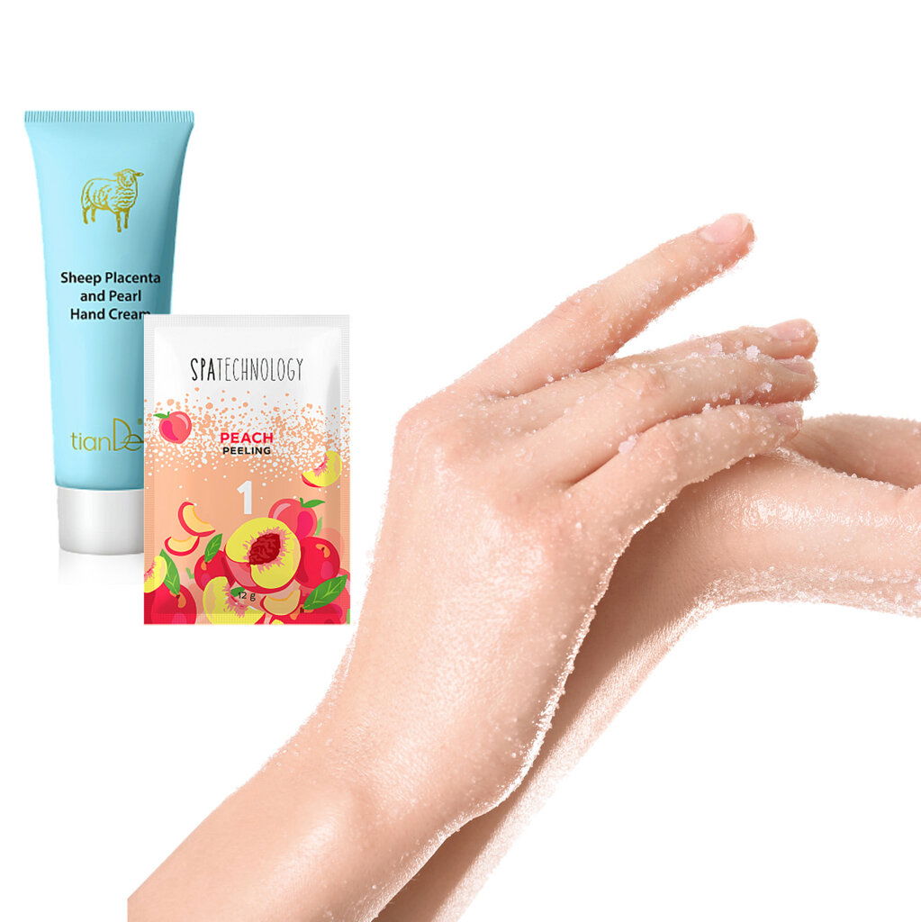 Doprajte svojim rukám luxusnú starostlivosť s balíkom obsahujúcim regeneračný krém s placentou a perlovým práškom na omladenie pokožky a broskyňový peeling na dokonalý peeling. Získajte broskyňový peeling ako darček! Ideálna kombinácia pre ženy, ktoré chcú mať ruky vždy jemné, mladistvé a krásne. Prírodné zloženie tianDe zaisťuje hĺbkovú výživu a komplexnú obnovu pokožky rúk.