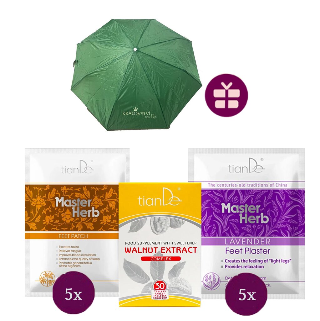 Komplexný detoxikačný balíček tianDe kombinuje vnútornú očistu pečene s vonkajšou detoxikáciou prostredníctvom chodidiel. Obsahuje výťažok z vlašských orechov na podporu funkcie pečene a dva varianty detoxikačných náplastí na chodidlá na odstránenie škodlivých látok z tela. Ako darček dostanete elegantný zelený dáždnik tianDe. Ideálna jarná kúra pre ženy, ktoré chcú podporiť svoje zdravie a cítiť sa ľahko a vitálne.